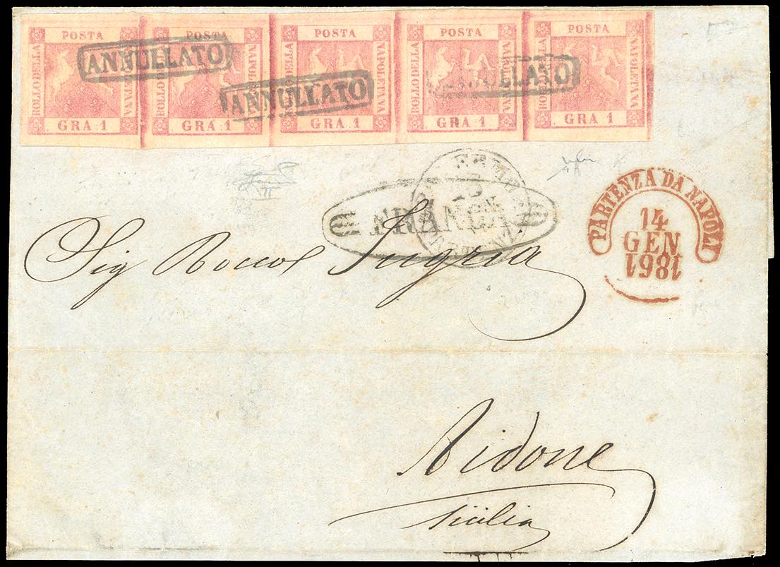 1861 - 1 grano rosa carminio, II tavola (4), striscia orizzontale di 5, filigrana capovolta, perfetta e di eccezionale freschezza, su lettera, incompleta al verso da Napoli 14/1/1861 (anno capovolto), ad Aidone, in Sicilia, bollo ovale "franca" e datario "Palermo Partenza" (per errore!), apposto in arrivo. Molto bella. Chiavarello, Ferrario. Ex coll. Imperato.