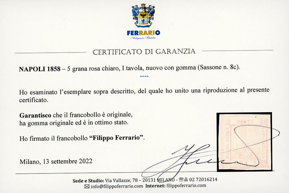 1858 - 5 grana rosa chiaro, I tavola (8c), gomma originale, ottimo stato. Colla, Cert. Ferrario.