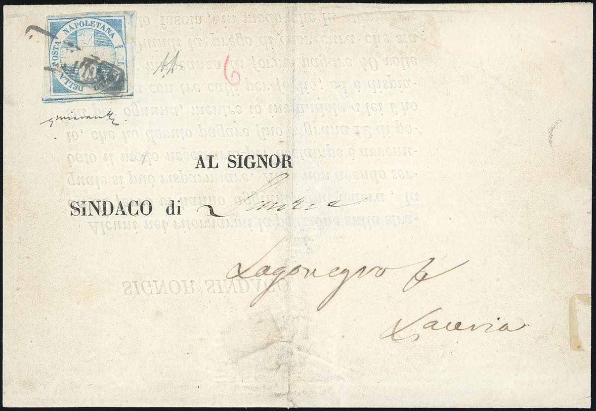 1860 - 1/2 tornese azzurro chiaro Crocetta (16a), perfetto, su circolare da Napoli 15/12/1860 a Lauria. Molto rara e bella! Chiavarello, ... Read more
