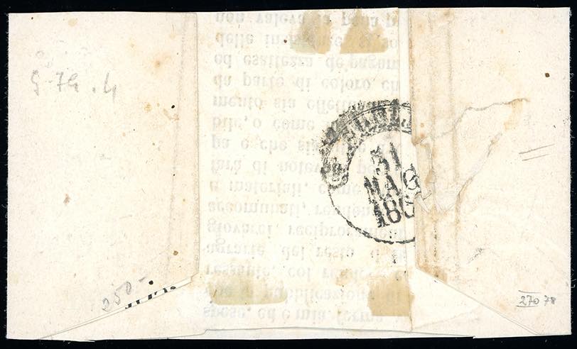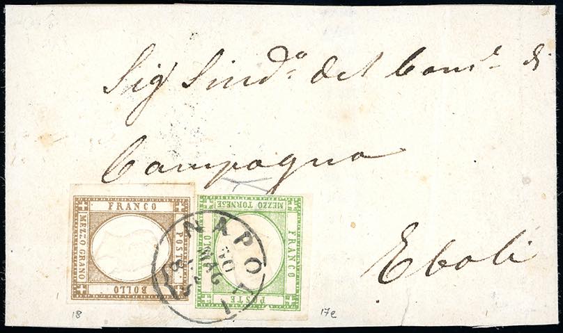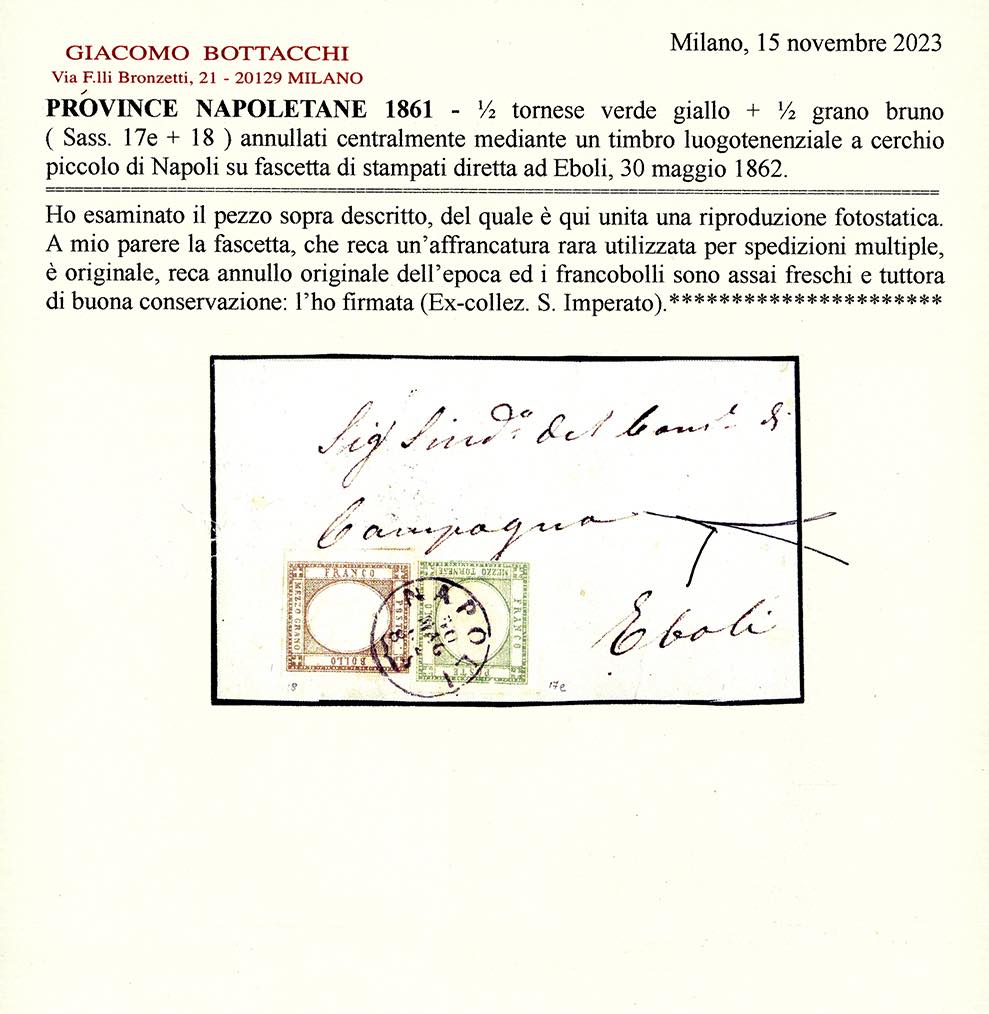 1862 - 1/2 tornese verde giallo, 1/2 grano bruno (17e,18), il primo con tre ottimi margini, leggermente intaccato in basso, il secondo perfetto, su fascetta completa da Napoli 30/5/1862 ad Eboli, bollo d'arrivo al verso. Pregevole affrancatura di porto multiplo per stampati. Cert. Bottacchi. Ex coll. Imperato.
