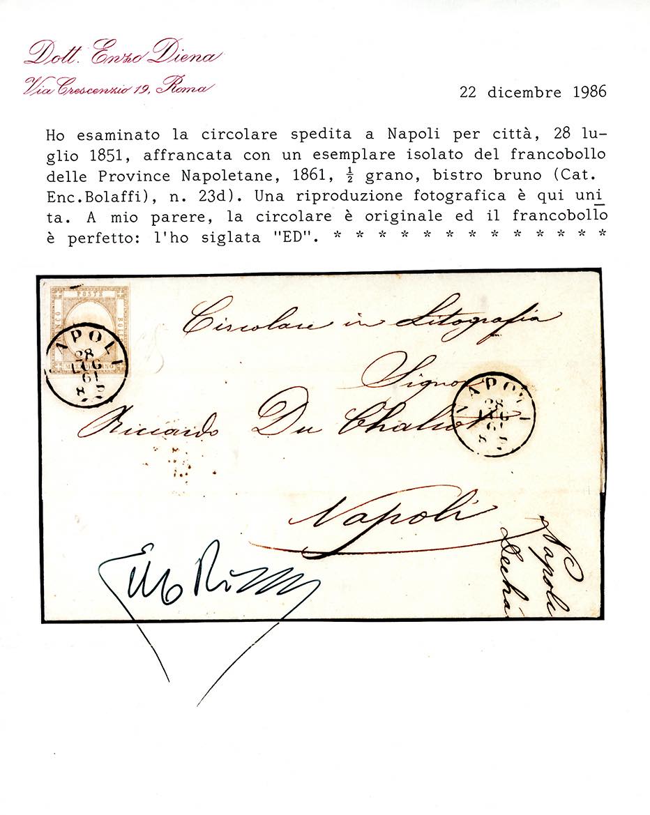 1861 - 1/2 grano bruno grigiastro (18c), perfetto, isolato su circolare da Napoli 28/7/1861 per città. Rara. Em.Diena, cert. Sorani ed E.Diena. Ex coll. Provera.