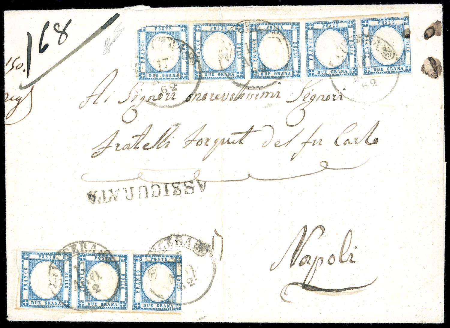 1862 - 2 grana azzurro chiaro (20), striscia di cinque (la massima possibile), e di tre, difetti, su fresca lettera assicurata di porto multiplo da Lucera 17/8/1862 a Napoli. Rara affrancatura. Ferrario. Ex coll. Imperato.