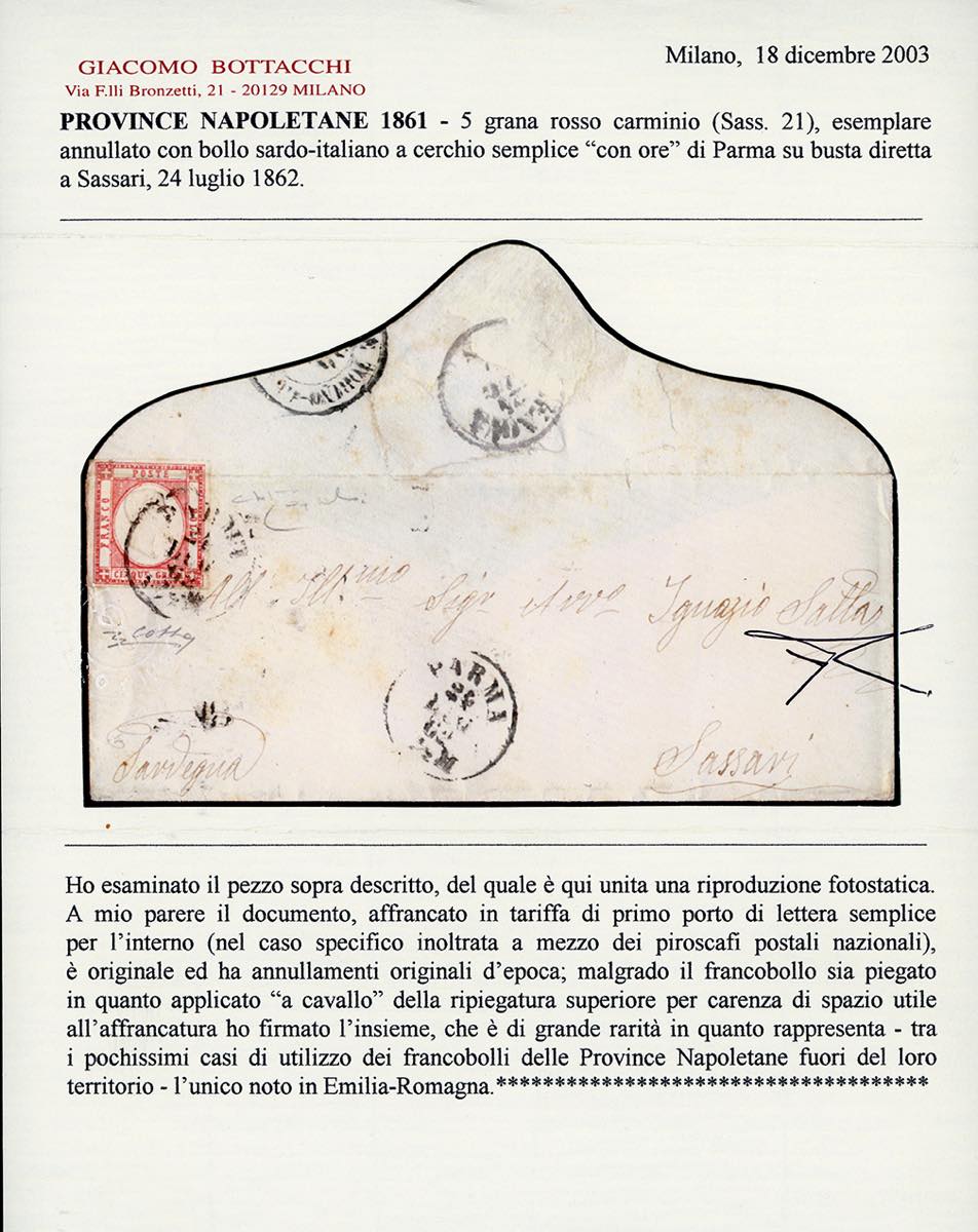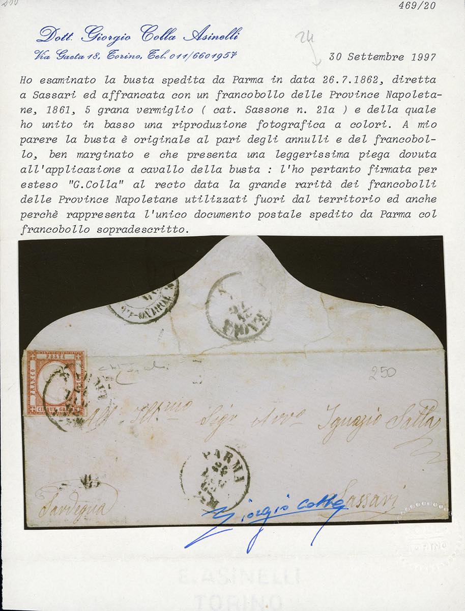 1862 - 5 grana rosso carminio (21), applicato a cavallo, su busta da Parma 24/7/1862 a Sassari. Eccezionale caso di utilizzo di un francobollo delle Province Napoletane al di fuori del proprio territorio. UNICO NOTO per questa località e in tutta l'Emilia Romagna. Raybaudi, cert. Bottacchi e Colla.