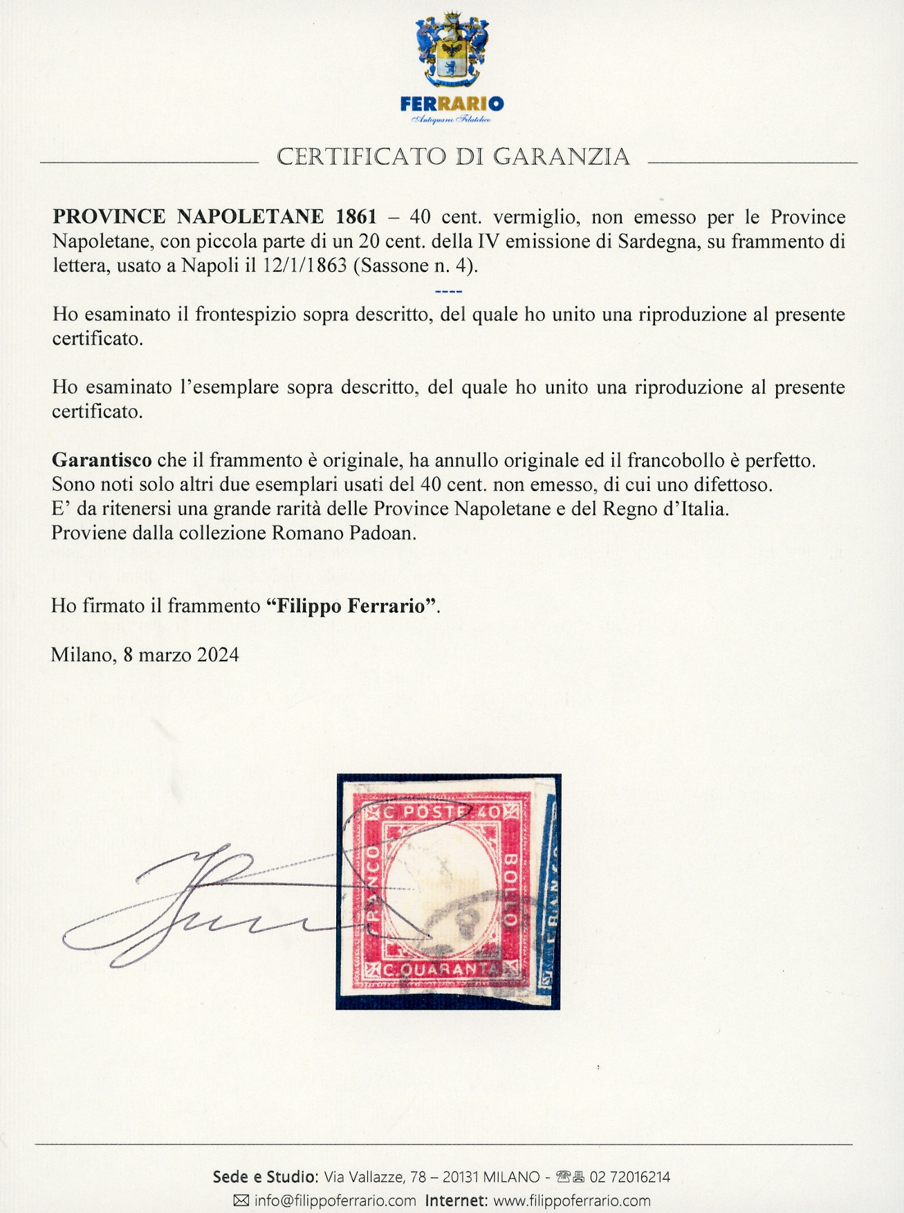 1863 - 40 cent. vermiglio, NON EMESSO per le Province Napoletane (4), perfetto, usato su piccolo frammento di lettera a Napoli il 12 gennaio (1863), unitamente a piccola parte di un 20 cent. della IV emissione di Sardegna. Si conoscono usati solo un altro esemplare perfetto ed uno difettoso in affrancatura mista con 5 cent. della IV emissione di Sardegna. Insieme splendido e grande rarità delle Province Napoletane e del Regno d'Italia. Cert. Bottacchi e Ferrario. Ex collezione Romano Padoan.