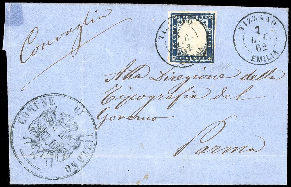 TIZZANO, sardo italiano punti 13 - 20 cent. IV emissione di Sardegna (15E), sfiorato in basso in un punto, su lettera del 7/6/1862 a Parma. Raro annullo.