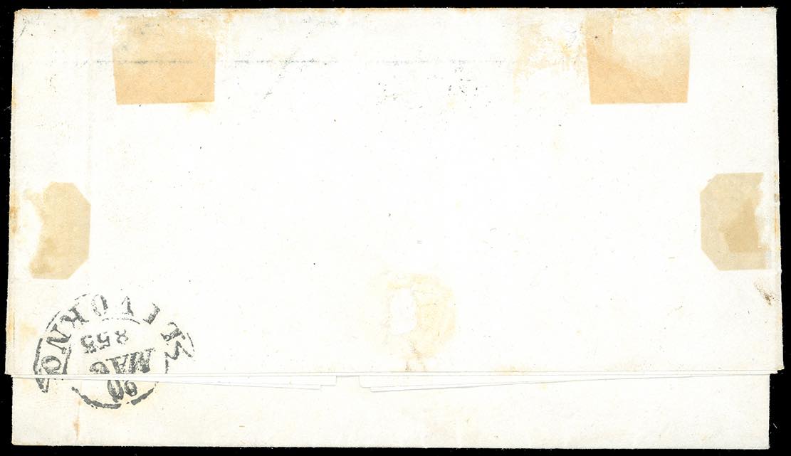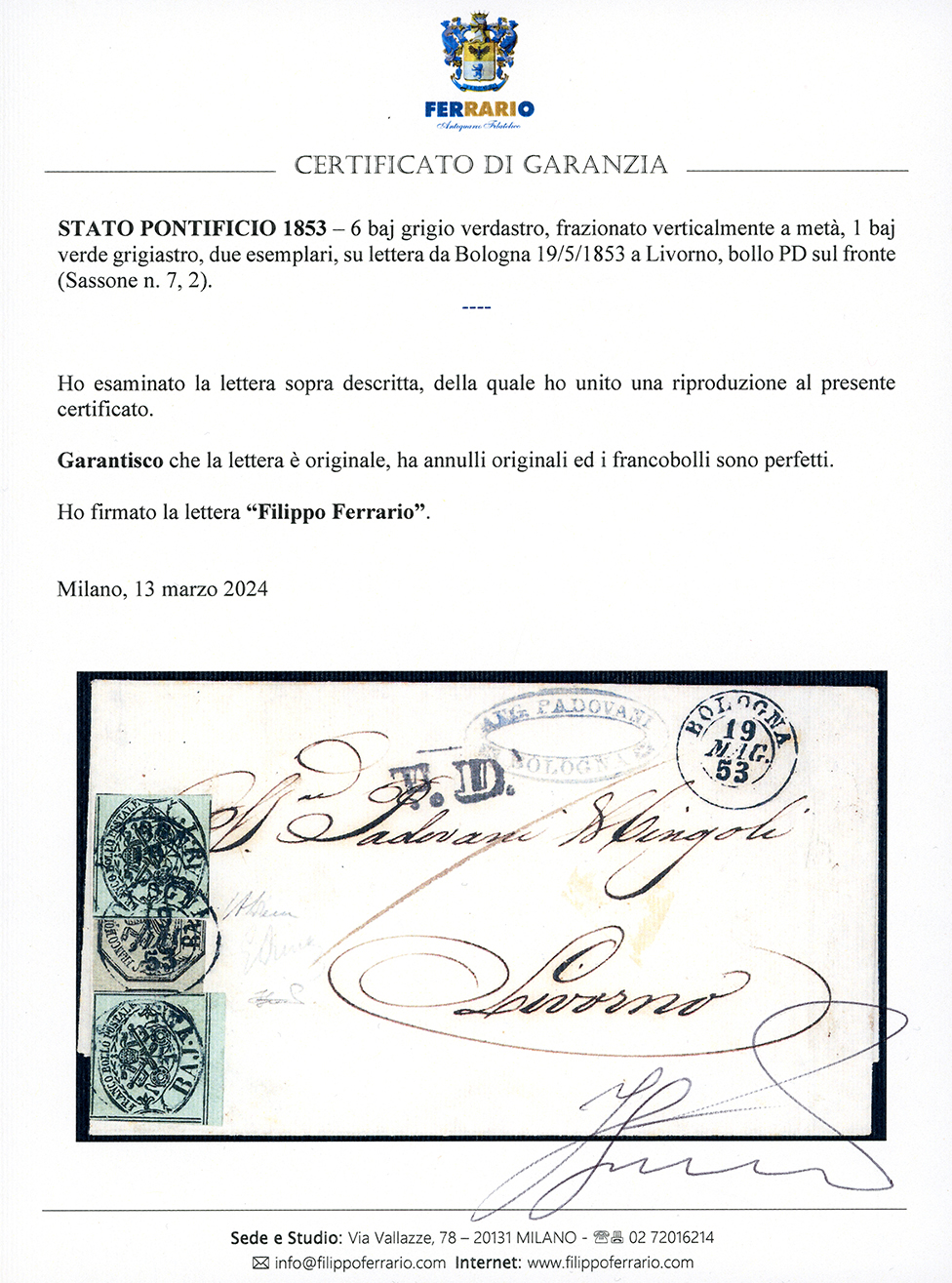 1853 - 6 baj grigio verdastro, frazionato verticalmente a metà, 1 baj verde grigiastro, due esemplari, uno bordo di foglio (7,2), su fresca lettera da Bologna 19/5/1853 a Livorno, bollo PD sul fronte. Molto bella e di grande impatto visivo. Emilo ed Alberto Diena, cert. Ferrario.