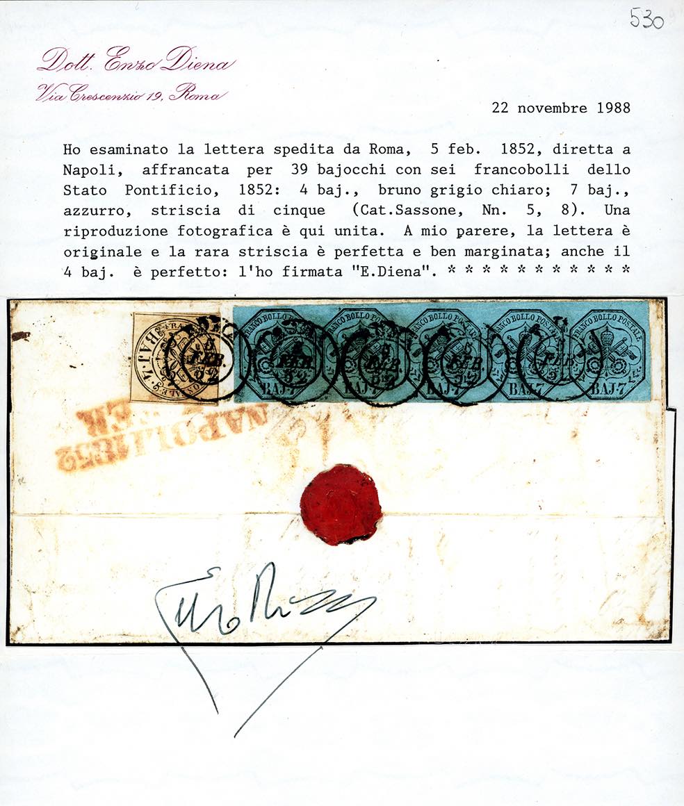 1852 - 7 baj azzurro, striscia orizzontale di cinque, 5 baj bruno grigio chiaro (8,5), perfetti e ben marginati, applicati al verso, in contrasto con il Regolamento postale, su lettera da Roma 5/2/1852 a Napoli, bollo pontificio "Roma franca" e borbonico "franca" in ovale. Insieme molto interessante e probabilmente unico. Chiavarello, cert. E.Diena. Ex coll. Imperato.