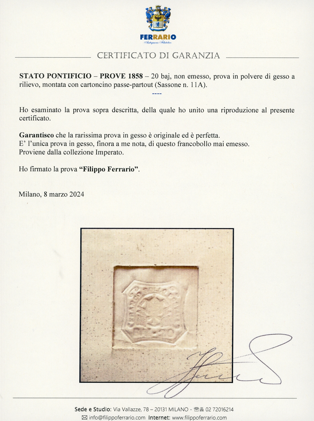 1858 - 20 baj, non emesso, prova in polvere di gesso a rilievo (11A), montata con cartoncino passe-partout, perfetto. Splendida ed UNICA PROVA ESISTENTE di questo rarissimo francobollo. Cert. Diena e Ferrario. Ex coll. Imperato.