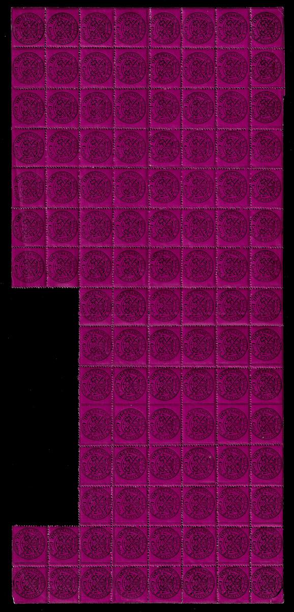 1868 - 20 cent. solferino (28), foglio quasi completo, 110 esemplari, gomma originale integra, qualche esemplare con dentellatura aperta, ottimo stato. Molto fresco e non comune.