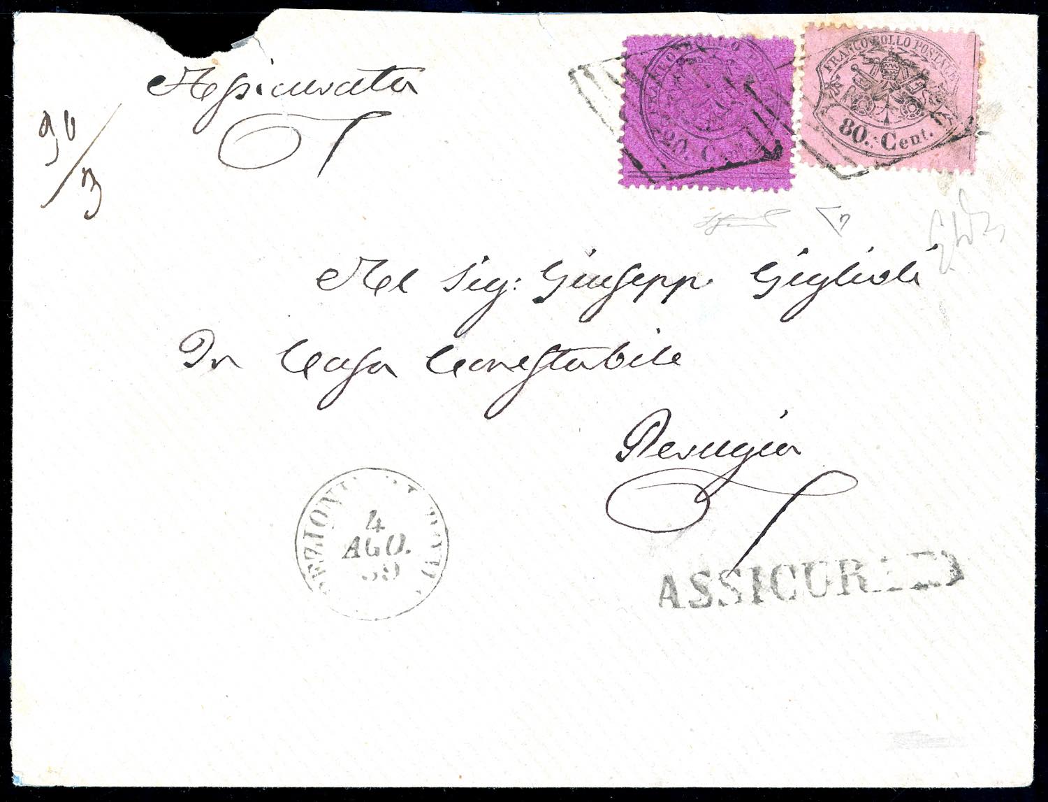 1869 - 80 cent. rosa chiaro, 20 cent. lilla rosa (30,28e), perfetti, su fresca busta assicurata da Roma 4/8/1869 a Perugia. Em. ed E.Diena, ... Read more