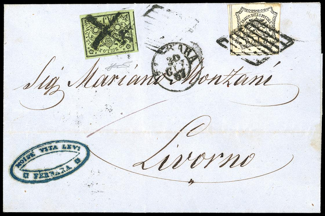 FERRARA, muto a losanga + muto a croce - 2 baj, 8 baj (3,9), perfetti, su lettera di doppio porto del 30/6/1857 a Livorno. Il francobollo ... Read more