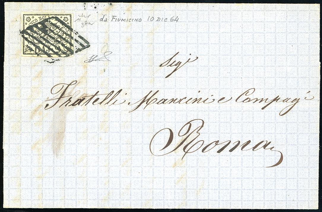 FIUMICINO, punti 12 - 2 baj (3Aa), perfetto, su lettera del 10712/1864 a Roma. Le lettere da Fiumicino a Roma venivano trasportate con il sistema dell'alaggio, tramite imbarcazioni trainate da buoi. Molto interessante. Chiavarello, Ferrario. Ex coll. Imperato.