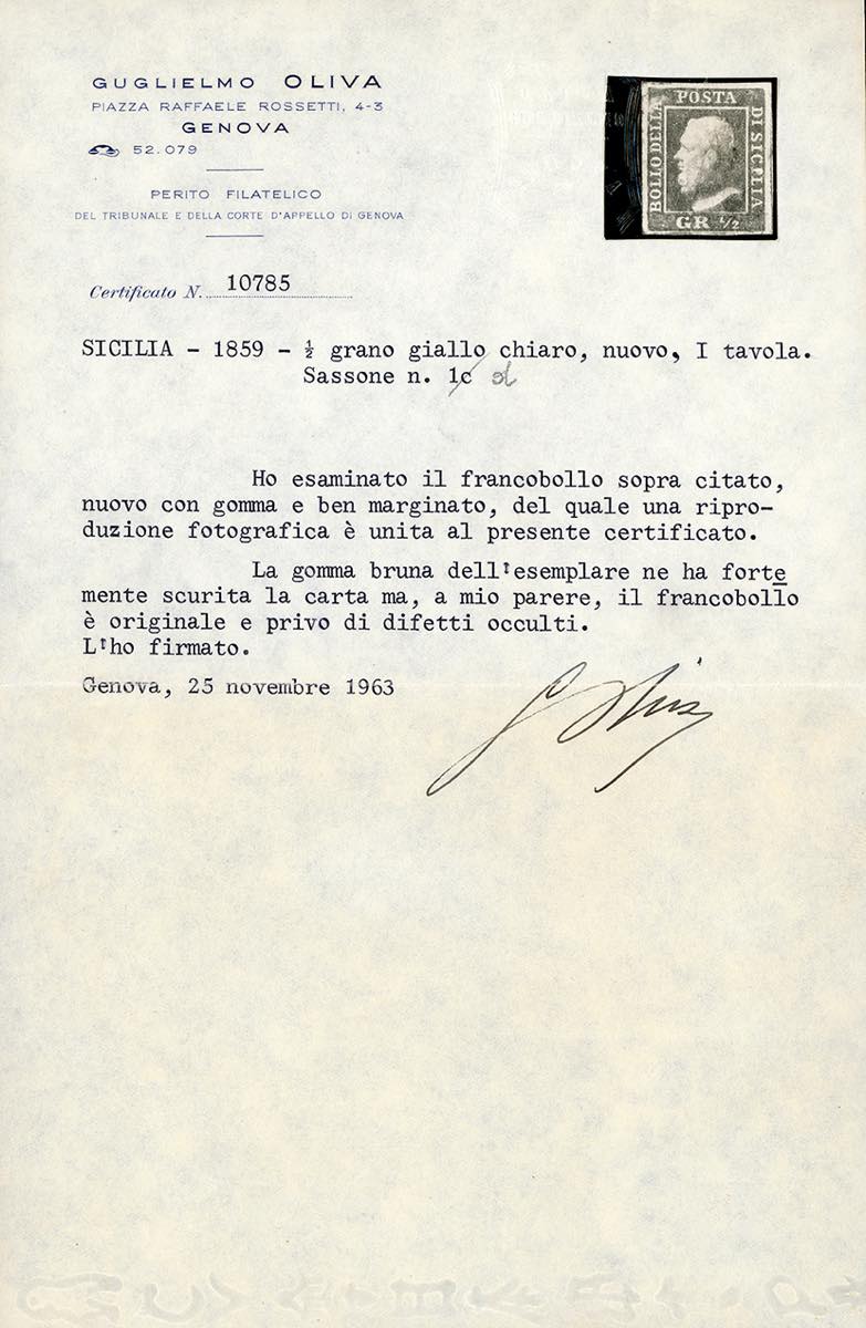 1859 - 1/2 grano giallo chiaro, I tavola, carta di Napoli (1d), gomma originale, ottimo stato. Raro colore. A.Diena, cert. G.Oliva.