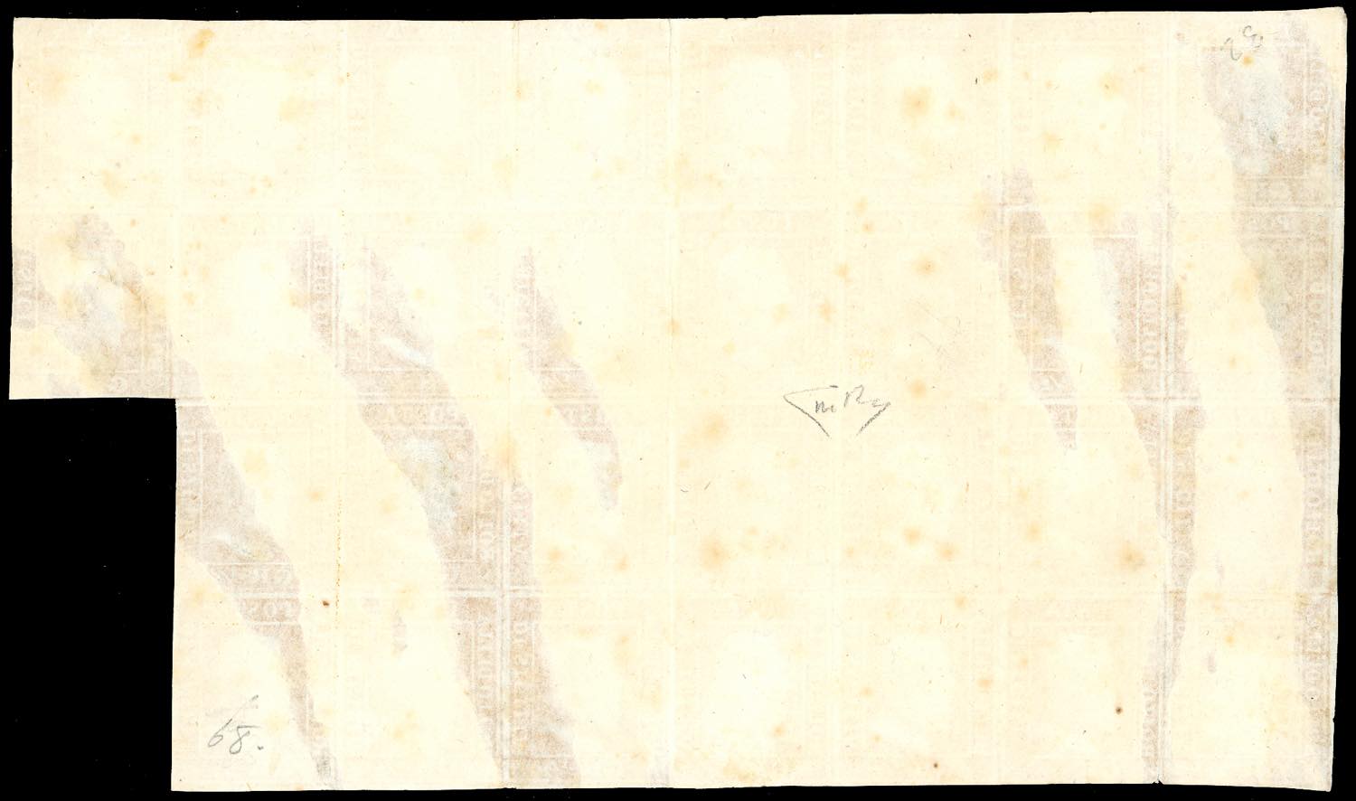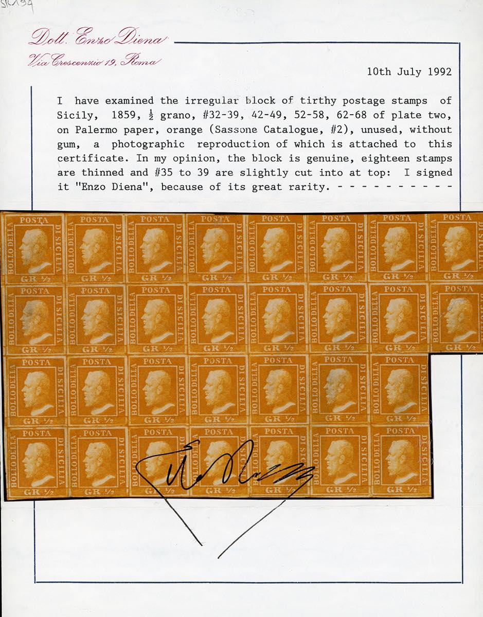 1859 - 1/2 grano arancio, II tavola, carta di Palermo (2), blocco di 30 esemplari, posiz. 32-39, 42-49, 52-58, 62-68, nuovo senza gomma. Nonostante i diffusi ma leggeri assottigliamenti al verso, si tratta del MASSIMO MULTIPLO NOTO di questa tavola. Rarità per specialista. Cert. E.Diena. Ex coll. Rothschild.