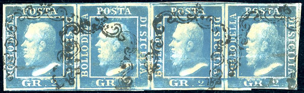 1859 - 2 grana cobalto, II tavola, carta di Napoli (7b), striscia orizzontale di quattro, posiz. 87-90, usata, lieve piega orizzontale. Rara e di buon aspetto. Cert. Raybaudi.