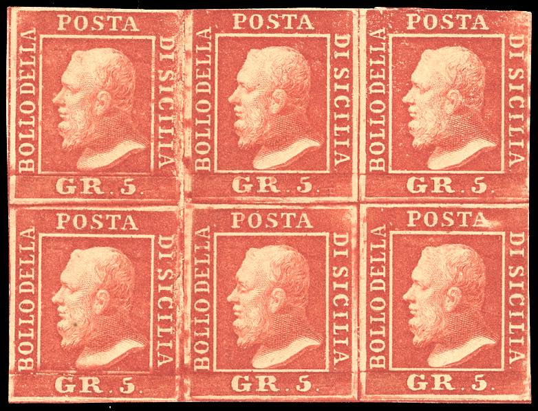 1859 - 5 grana rosso sangue, I tavola (9c), blocco di sei esempalri, posiz. 75-77, 85-87, gomma originale, integra per un esemplare, perfetto e molto fresco. Eccezionale multiplo di questa pregevole tonalità, si tratta del massimo blocco noto. Rarità dei francobolli nuovi di Sicilia. Em.Diena, cert. E.Diena.