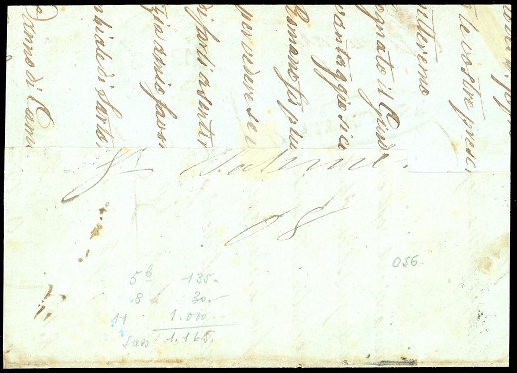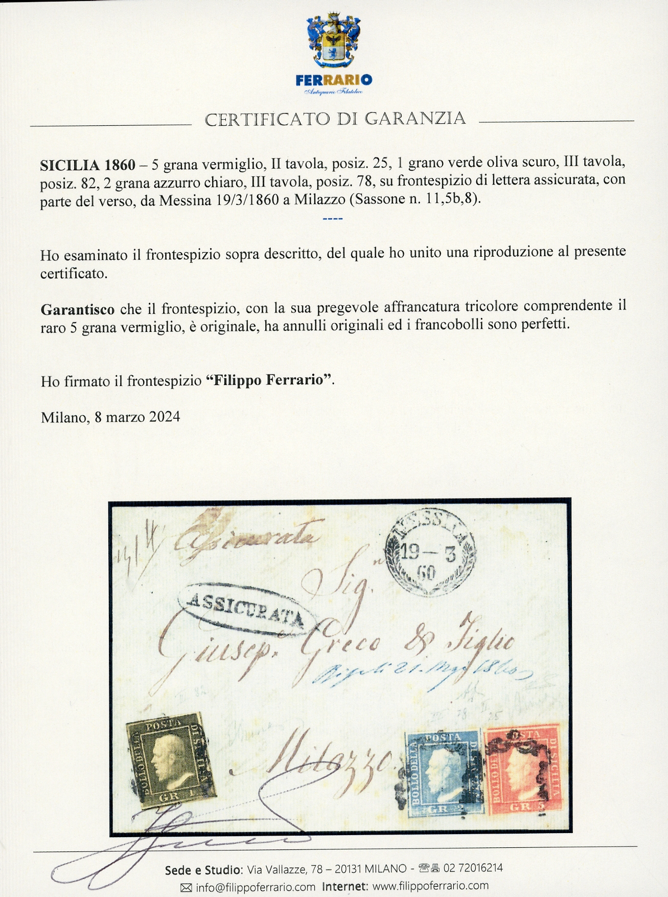 1860 - 5 grana vermiglio, II tavola, posiz. 25, 1 grano verde oliva scuro, III tavola, posiz. 82, 2 grana azzurro chiaro, III tavola, posiz. 78 (11,5b,8), perfetti, su frontespizio completo con parte del verso di lettera assicurata da Messina 19/3/1860 a Milazzo. Pregevole affrancatura tricolore comprendente il raro 5 grana vermiglio. Emilio ed Alberto Diena, cert. Ferrario. (Cat. Sassone € 40.000 per la busta, 50% per il frontespizio).
