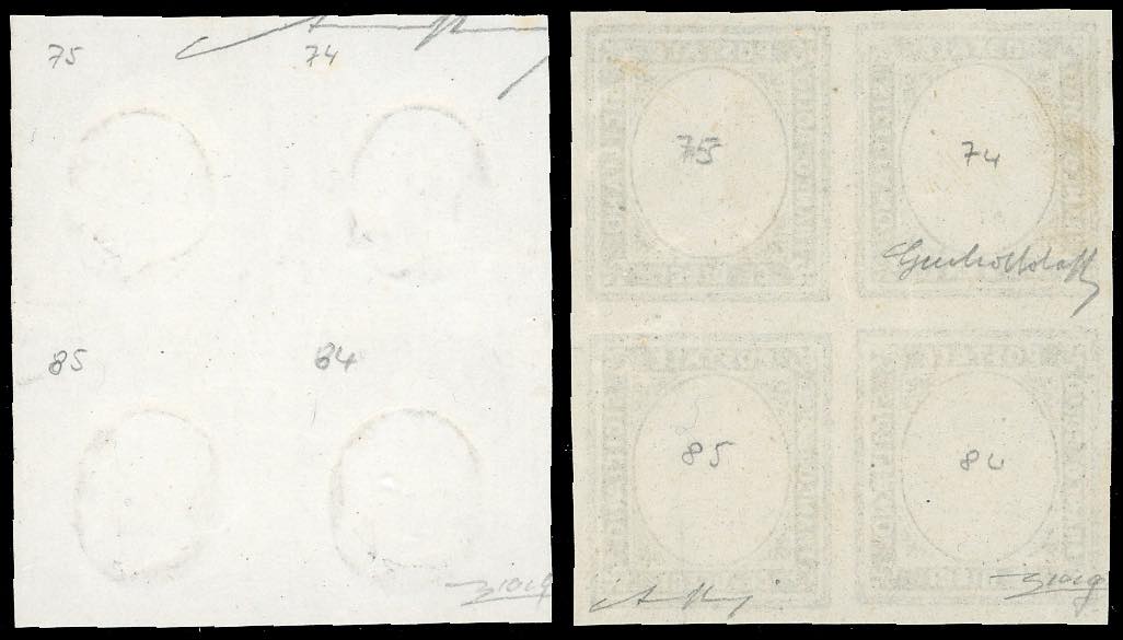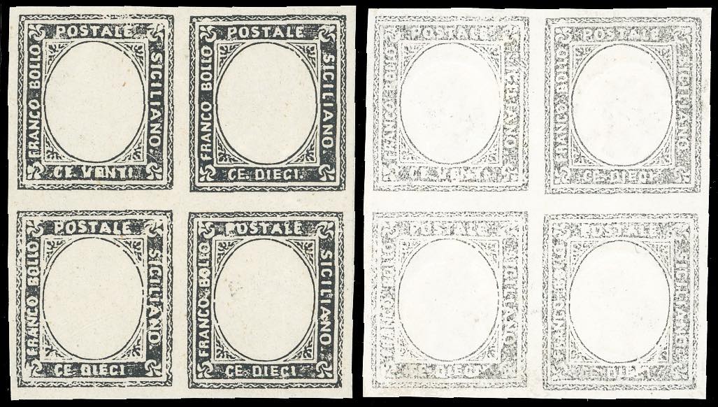 1860 - Saggi Ficarotta. Eccezionale insieme composto dai saggi non adottati, in due blocchi di quattro, senza gomma come sempre, perfetti. Il primo blocco è composto dal primo esemplare da 20 cent. e gli altri da 10 cent. nero, su carta bianca, senza effigie (P64,P65). Il secondo blocco è composto sempre dal primo esemplare da 20 cent. e gli altri da 10 cent. in grigio nero, carta bianca, con l'effigie debolmente impressa come sempre (P67,P68). Si tratta di un insieme straordinario, infatti gli esemplari da 20 cent. erano presenti solo tre volte nel foglio di 100, mentre gli altri esemplari erano da 10 cent. Rarità del settore. Cert. Enzo Diena ed Alberto Bolaffi Finanziario.