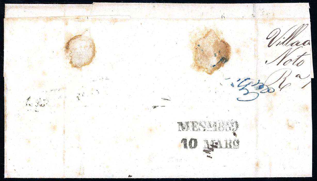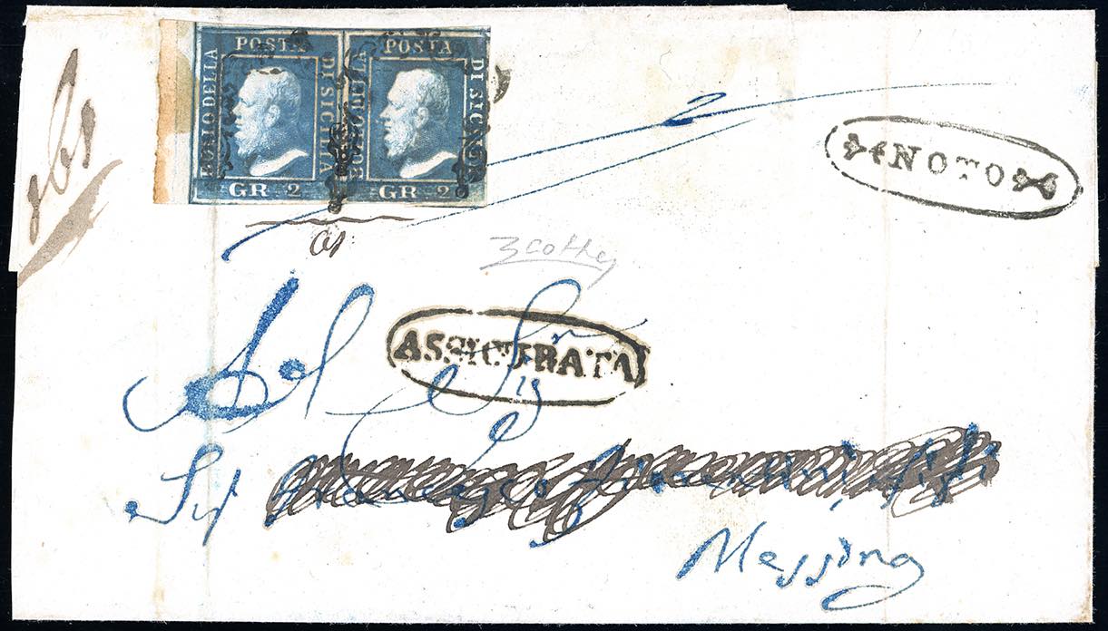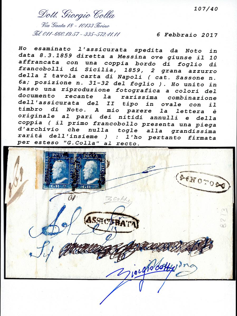 NOTO, ovale c. f. Assicurata (II tipo), punti R2 - 2 grana azzurro, I tavola (6a), coppia bordo di foglio, su assicurata del 8/3/1859 per Messina. Il primo francobollo presenta una piega d'archivio che nulla toglie alla grandissima rarità di questa lettera, che finora risulta essere l'unica nota con tali annullamenti. Cert. G.Colla.