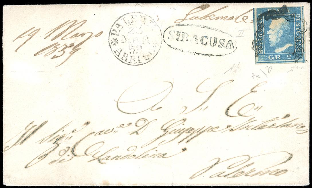 SIRACUSA, verde nerastro, punti 12 - 2 grana azzurro, carta di Napoli, II tavola (7a), perfetto, su lettera per Palermo 23/3/1859. A. ed E.Diena, Chiavarello. Ex coll. Imperato.