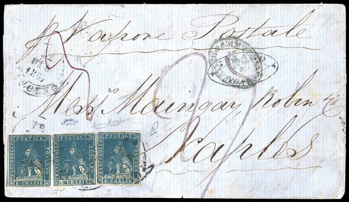 1857 - 6 crazie azzurro chiaro (15), tre esemplari, lievi imperfezioni di marginatura, su lettera via di mare da Livorno 12/12/1857 a Napoli, tassata 27 grana. Pregevole affrancatura multipla del 6 crazie della II emissione. Raybaudi, Chiavarello. Ex coll. Imperato.