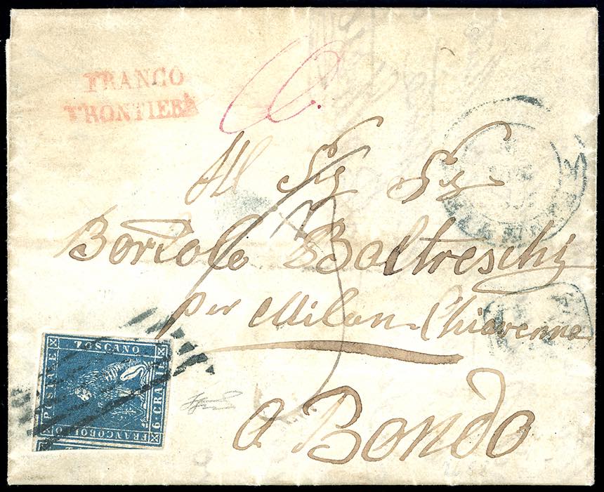 1857 - 6 crazie azzurro vivo, II emissione (15a), perfetto, su lettera da Firenze 6/7/1857 a Bondo, Cantone dei Grigiani, in Svizzera, via Milano-Chiavenna, bollo rosso "franco frontiera" e segni di tassa sul fronte. Non comune. Ferrario.