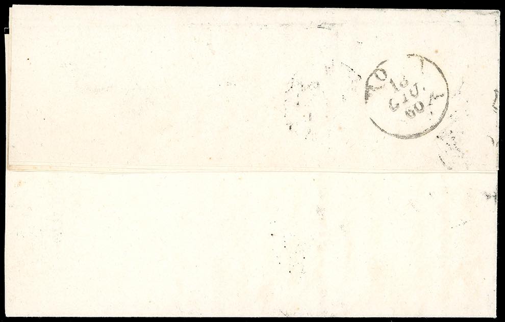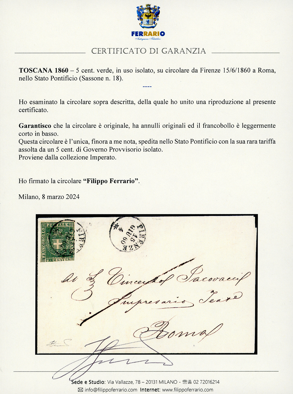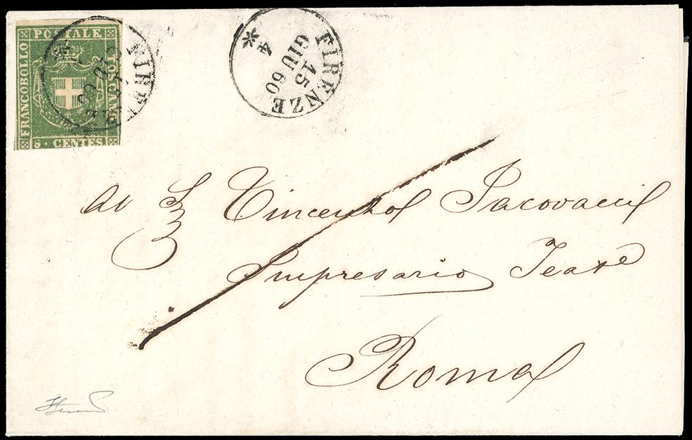 1860 - 5 cent. verde (18), leggermente corto in basso, in eccezionale uso isolato, su circolare da Firenze 15/6/1860 a Roma, nello Stato Pontificio. Straordinario uso isolato su circolare per l'estero. Il valore di catalogo si riferisce a lettere spedite all'interno. Questa è l'unica circolare nota spedita nello Stato Pontificio. Grande rarità per collezione specializzata. Cert. Ferrario. Ex coll. Imperato.