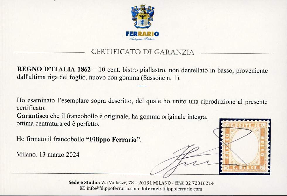 1862 - 10 cent. bistro giallastro (1), ottima centratura, non dentellato in basso perché proveniente dall'ultima riga del foglio, gomma ... Read more