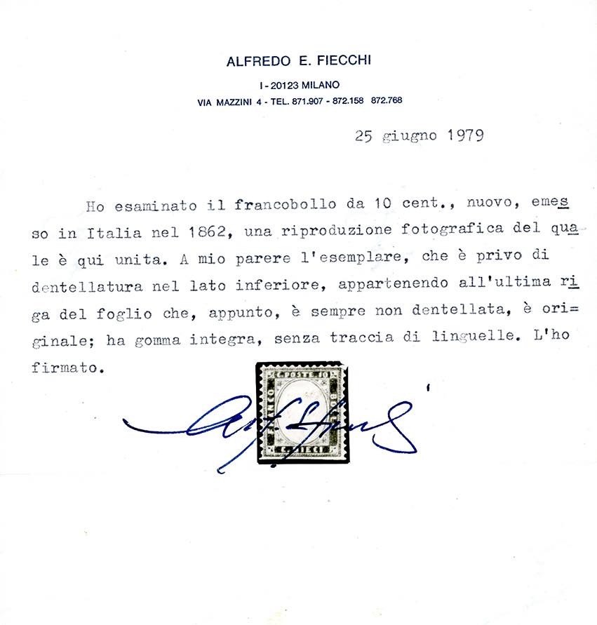 1862 - 10 cent. bistro giallastro (1), ottima centratura, non dentellato in basso perché proveniente dall'ultima riga del foglio, gomma originale integra, perfetto e molto fresco. Cert. Alberto e Raffaele Diena, Fiecchi e Ferrario.