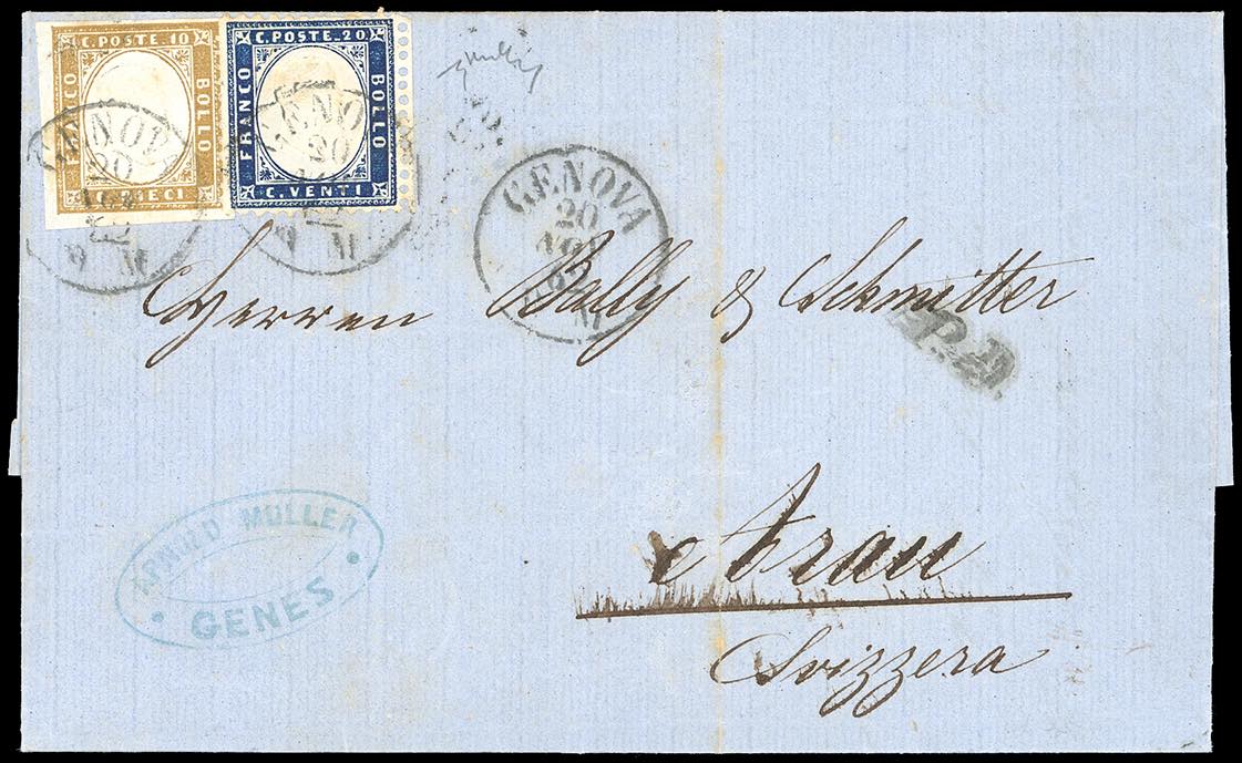 1862 - 20 cent. indaco (2), bordo di foglio, in affrancatura mista con 10 cent. bistro oliva IV emissione di Sardegna (14D), ottimo stato, su lettera da Genova 20/11/1862 ad Arau, in Svizzera. Non comune. Chiavarello. Ex coll. Imperato.