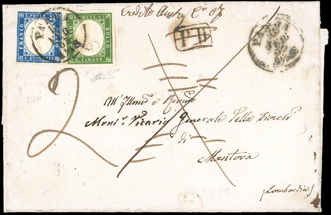 1863 - 15 cent. azzurro tipo Sardegna (11), in affrancatura mista con 5 cent. verde cupo IV emissione di Sardegna (13E), perfetti, su fresca lettera da Parma 15/2/1863 a Mantova. Il bollo PD e il segno a croce ad indicare che la lettera era franca a destino furono apposti in partenza, e successivamente cancellati perché la missiva era affrancata insufficientemente. Venne inoltre apposta la tassa 2 e l'indicazione manoscritta "Credito Austr.c.mi.7". Molto interessante e di ottimo aspetto. Ferrario.