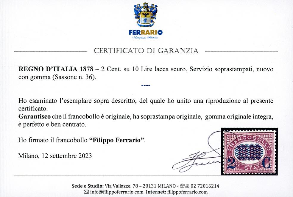 1878 - 2 cent. su 10 lire Servizio soprastampati (36), ben centrato, gomma originale integra, perfetto. Ottima qualità. Cert. Diena e ... Read more