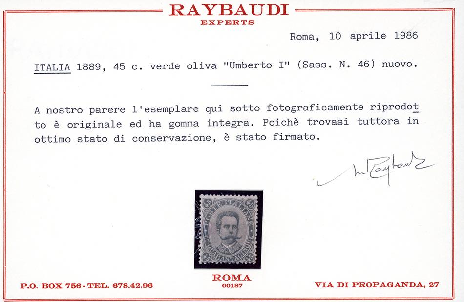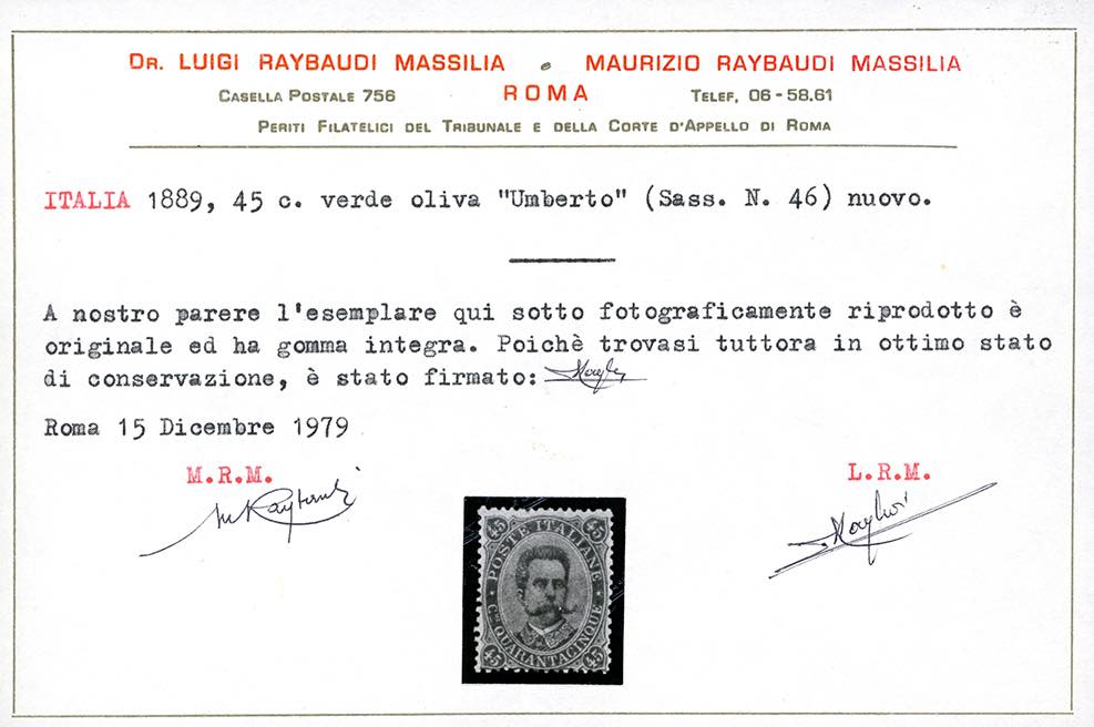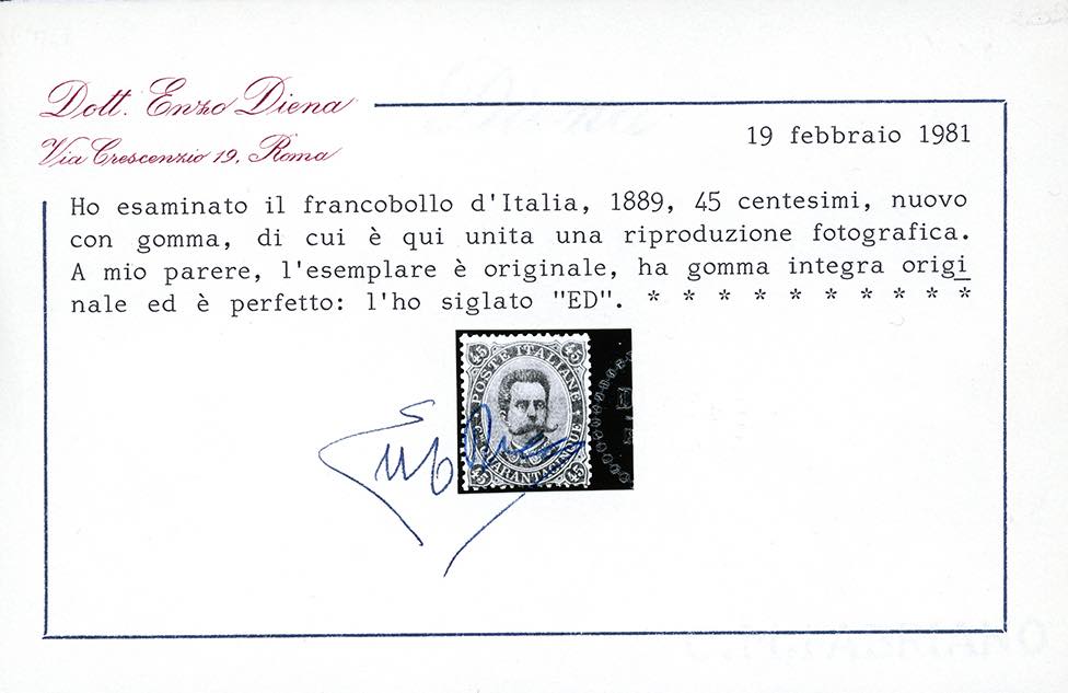 1855 - 45 cent. Umberto I (46), discreta centratura, gomma originale integra, perfetto. G.Oliva, cert. E.Diena, due cert. Raybaudi.