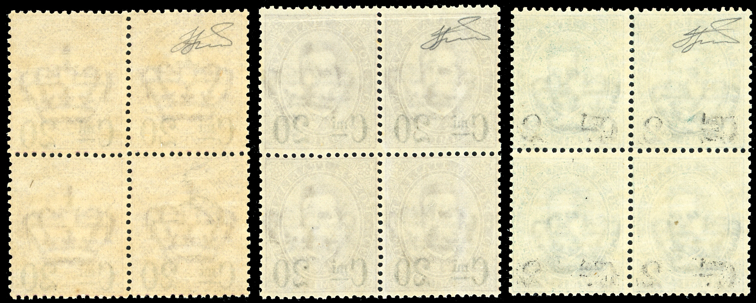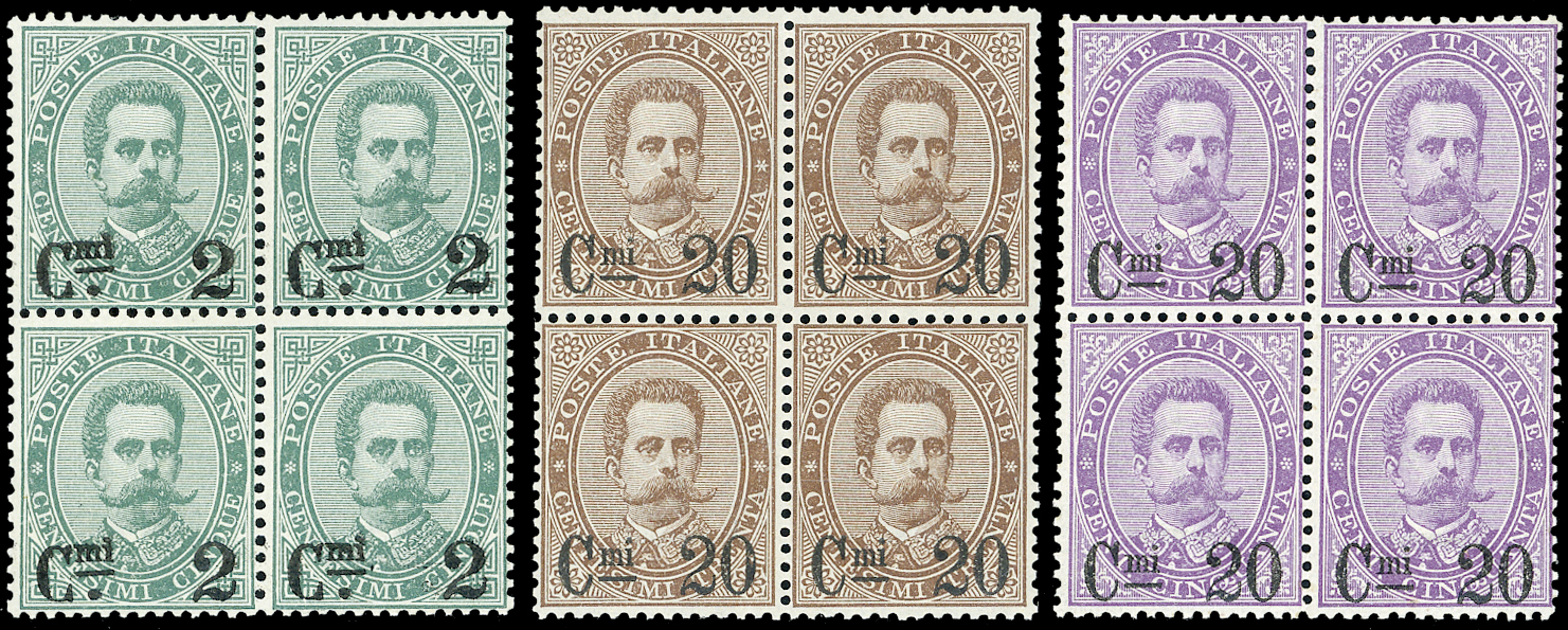 1890/91 - Soprastampati (56/58), blocchi di quattro, buona centratura, gomma originale integra, perfetti. Splendidi e rari! Cert. Ferrario.