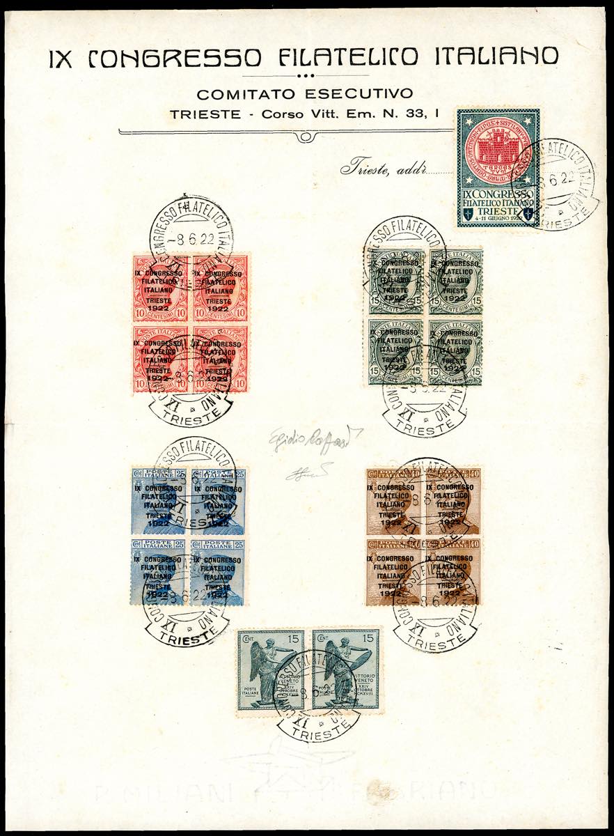 1922 - Soprastampati "CONGRESSO FILATELICO", serie completa (123/126), blocchi di quattro, perfetti, usati su foglio ufficiale intestato del "IX Congresso Filatelico Italiano", unitamente allo speciale erinnofilo della manifestazione ed una coppia 15 cent. Vittoria (121), tutti annullati con il bollo speciale di Trieste dell'8 giugno 1922. Insieme spettacolare ed estremamente raro. Da esposizione. Cert. Caffaz e Ferrario.