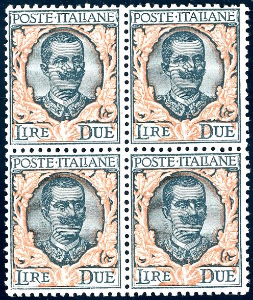 1923 - 2 lire Floreale (150), blocco di quattro, ben centrato, gomma originale integra, perfetto e molto fresco. Ferrario.