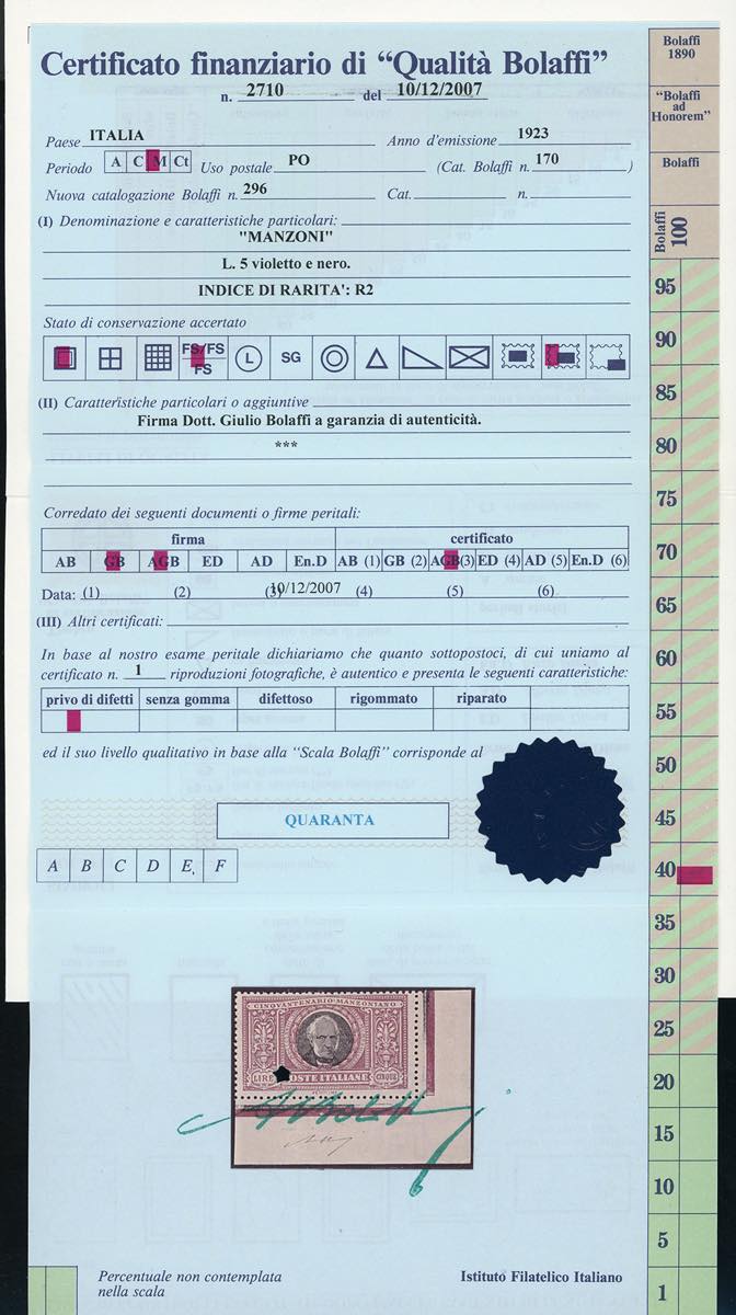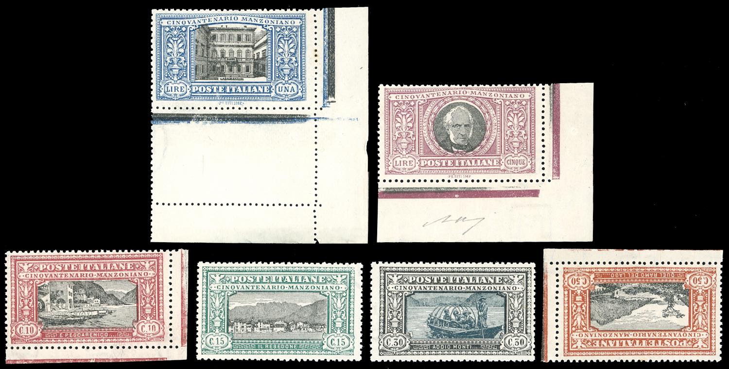 1923 - Manzoni, serie completa (151/156), i due alti valori con ampio angolo di foglio, gomma originale integra, perfetti. G.Bolaffi e ... Read more