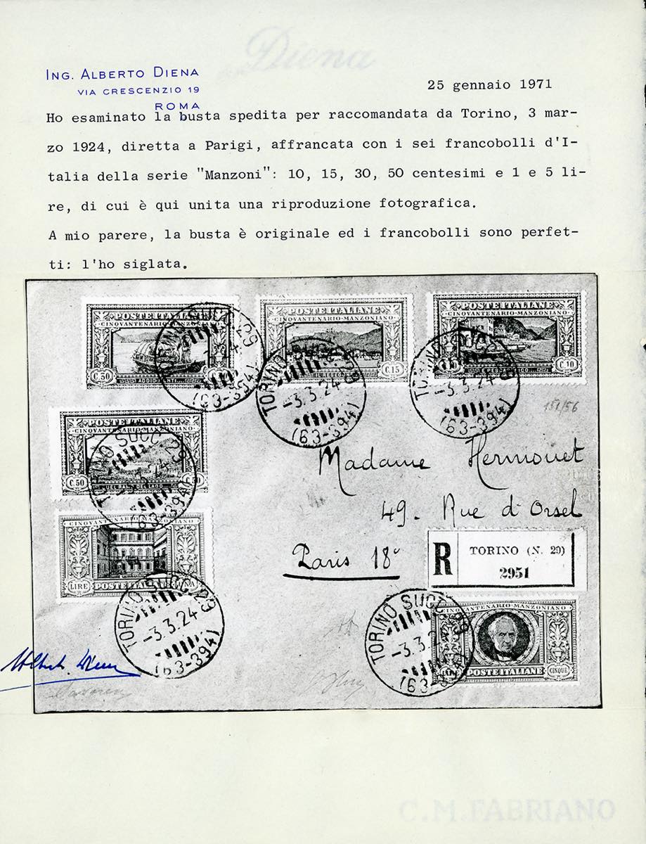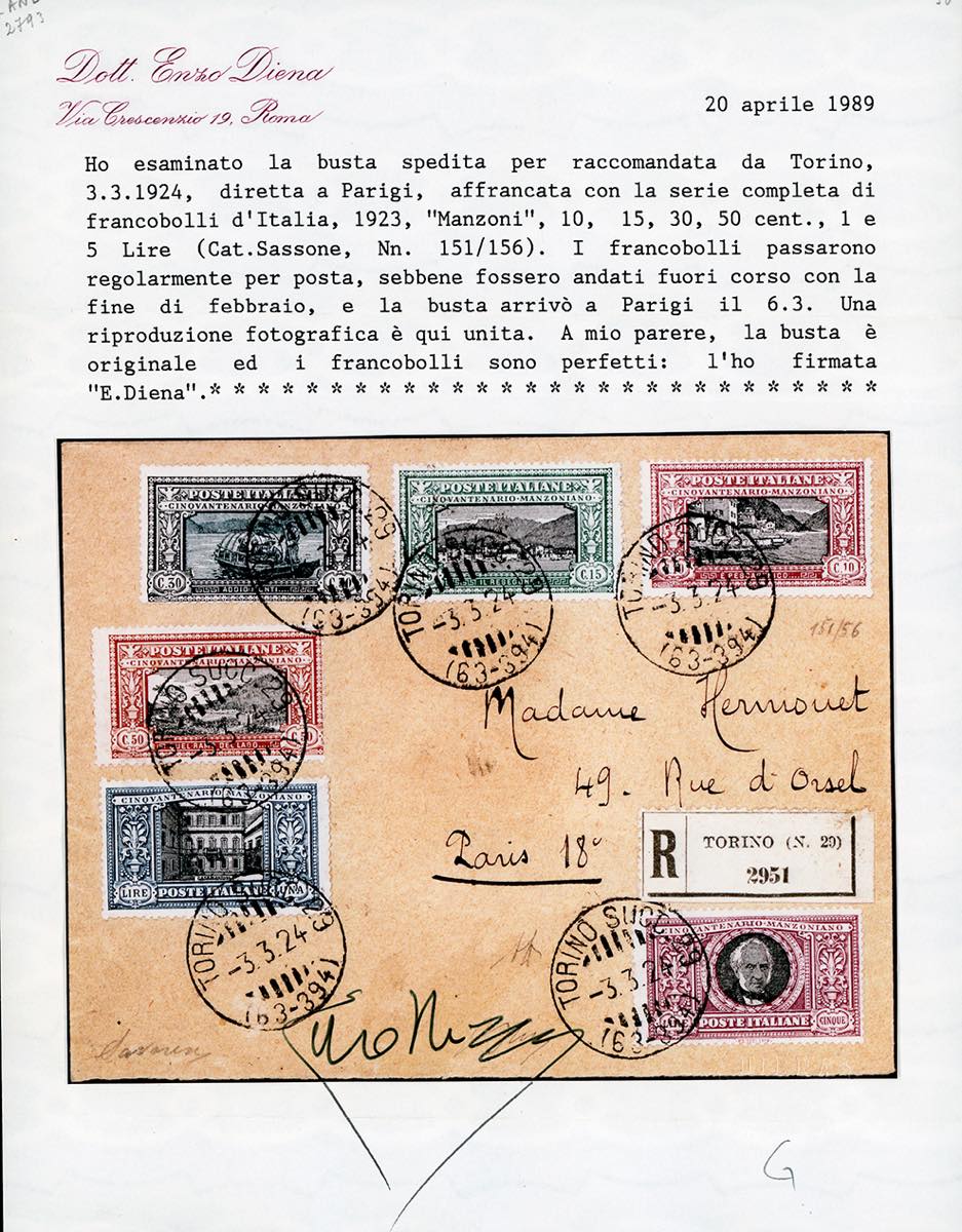 1924 - Manzoni, serie completa (151/156), perfetti, su busta raccomandata da Torino 3/3/1924 a Parigi, bollo d'arrivo. Malgrado i francobolli fossero andati fuori corso alla fine di febbraio, l'affrancatura venne considerara valida e la busta arrivò regolarmente a destino. Molto bella e rara. G.Oliva, Ferrario, cert. A. ed E.Diena.