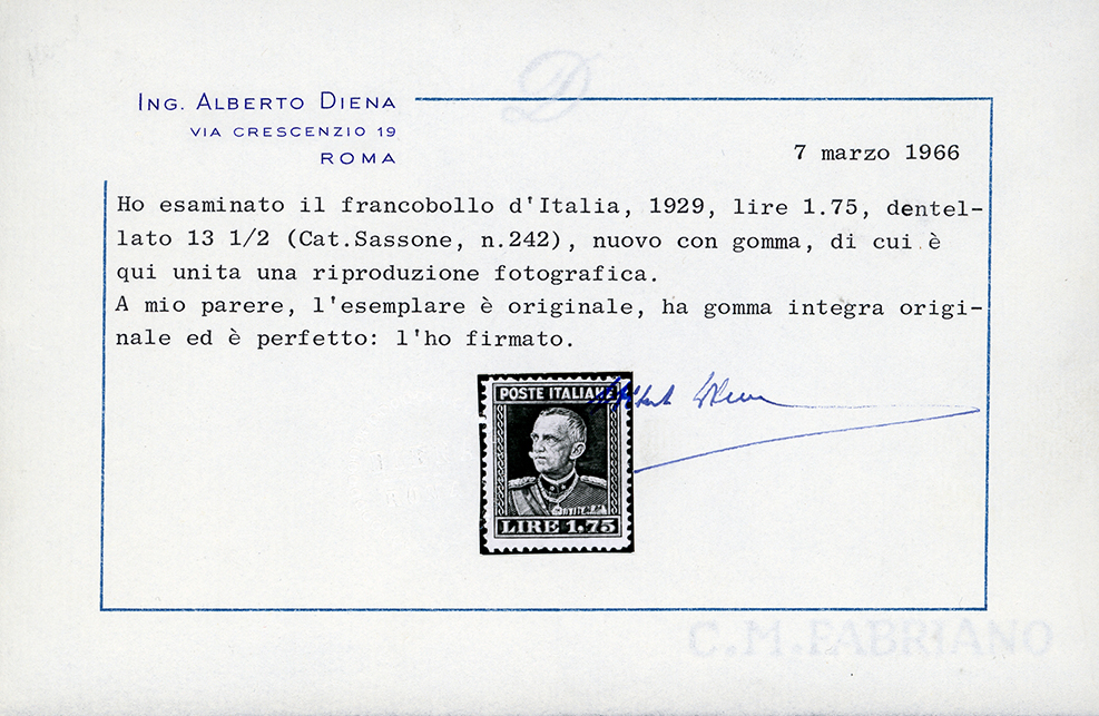 1929 - 1,75 lire bruno Vittorio Emanuele III, dent. 13 3/4 (242), gomma originale integra, perfetto e molto fresco. Ottima qualità, molto raro. Cert. A.Diena e Ferrario. Ex coll. Romano.