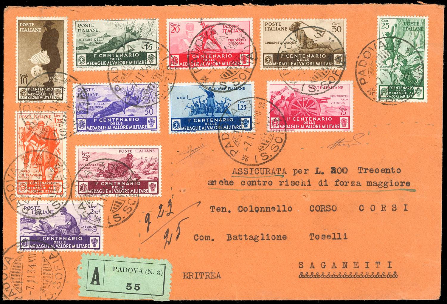 1934 - Medaglie al Valore, serie completa (366/376), perfetti, su busta assicurata contro rischi di forza maggiore per 300 lire, da Padova 7/11/1934 a Saganeiti, in Eritrea. Interessanti e molto rare le assicurate di forza maggiore. Sorani, Ferrario.