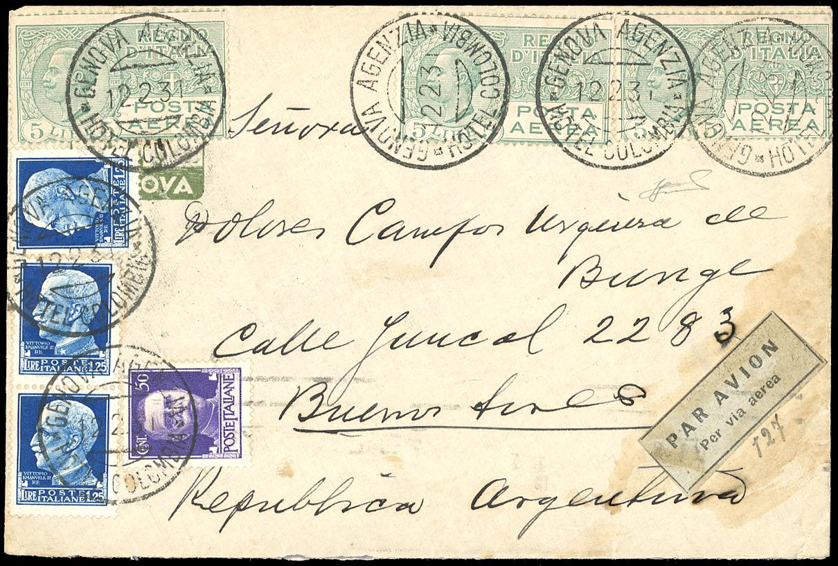 1931 - 5 lire Vittorio Emanuele III, tre esemplari, 50 cent. e 1,25 cent., tre esemplari, Imperiale (A7,251,253), ottimo stato, su aerogramma da "Genova Agenzia Hotel Columbia 12/2/1931" a Buenos Aires, bollo d'arrivo. Non comune. Ferrario.