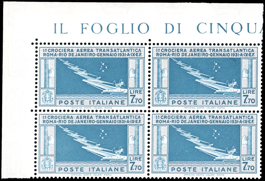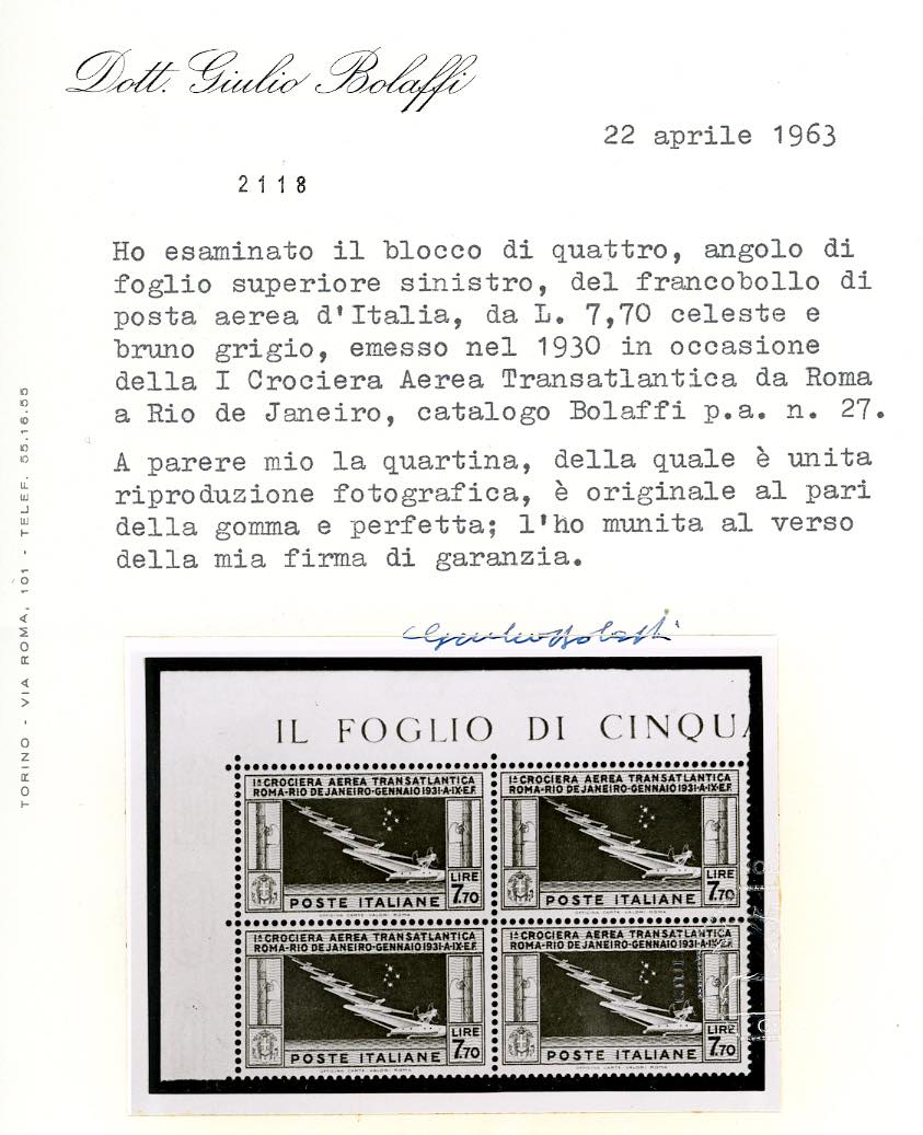 1930 - 7,70 lire Crociera Balbo (25), ottima centratura, blocco di quattro, angolo di foglio, gomma originale integra, perfetto. Cert. G.Bolaffi.