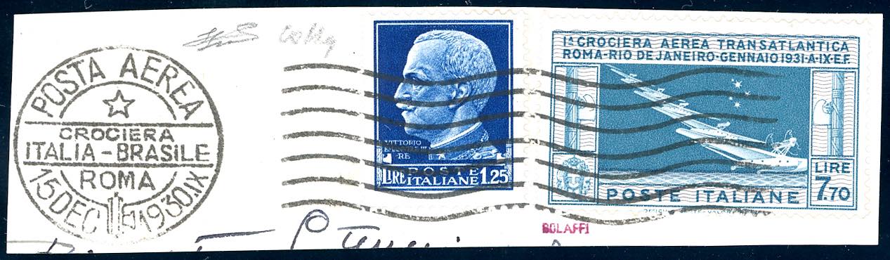 1930 - 7,70 lire Crociera Balbo, 1,25 lire Imperiale (A25,253), perfetti, usati su frammento con il bollo speciale del volo. Ferrario, cert. Colla.