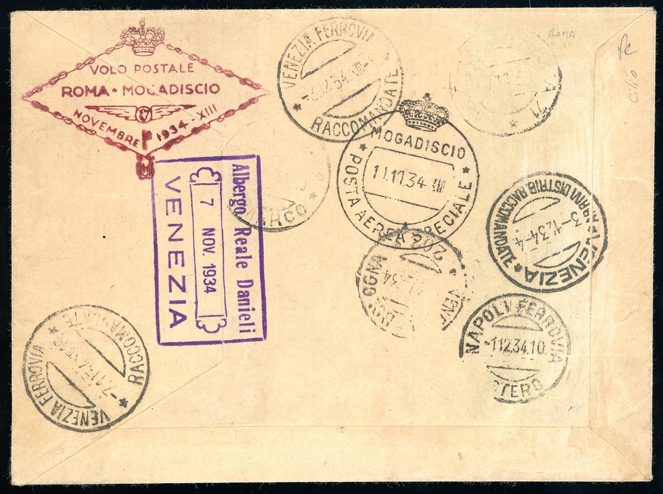 1934 - Volo Roma-Mogadiscio, serie completa (83/88), con complementare, perfetti, su aerogramma raccomandato da Venezia 7/11/1934 a Mogadiscio, rispedita al mittente, bolli speciali del volo sul fronte e al verso. Cert. Ferrario.