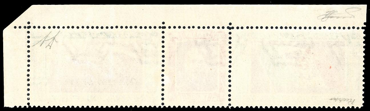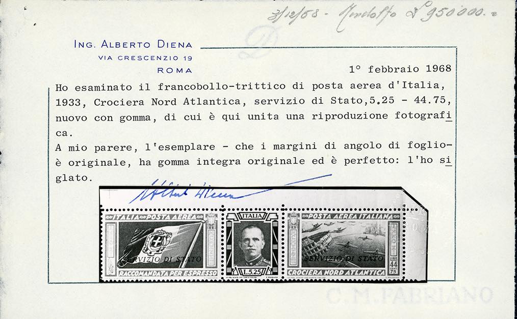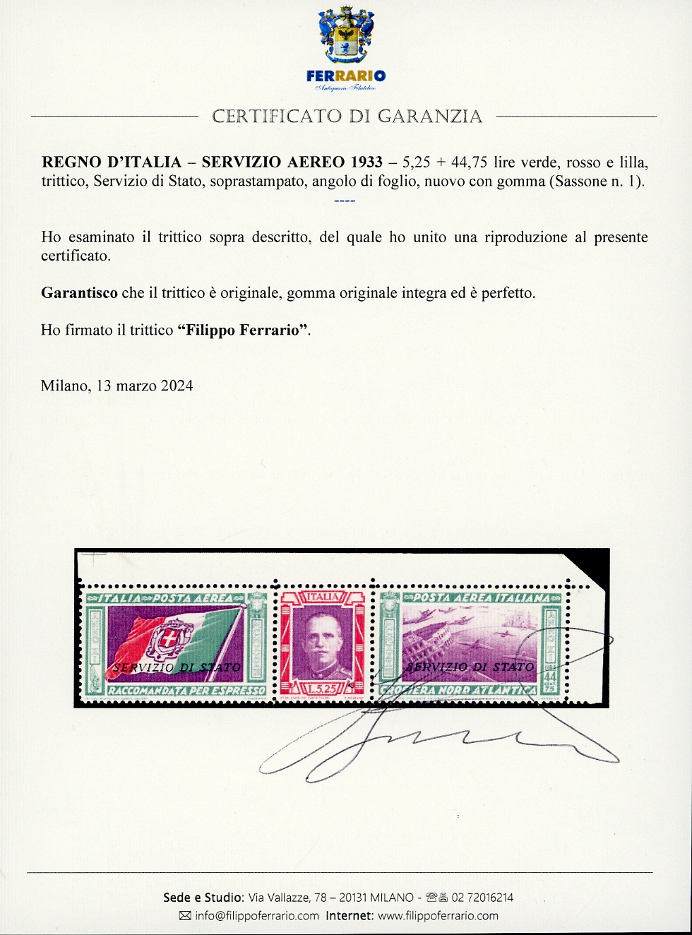 1933 - 5,25 + 44,75 lire trittico Servizio di Stato (1), ottima centratura, angolo di foglio, gomma originale integra, perfetto. Molto bello. Presenta inoltre la filigrana lettere 10/10 che lo impreziosisce notevolmente. Cert. A.Diena e Ferrario.
