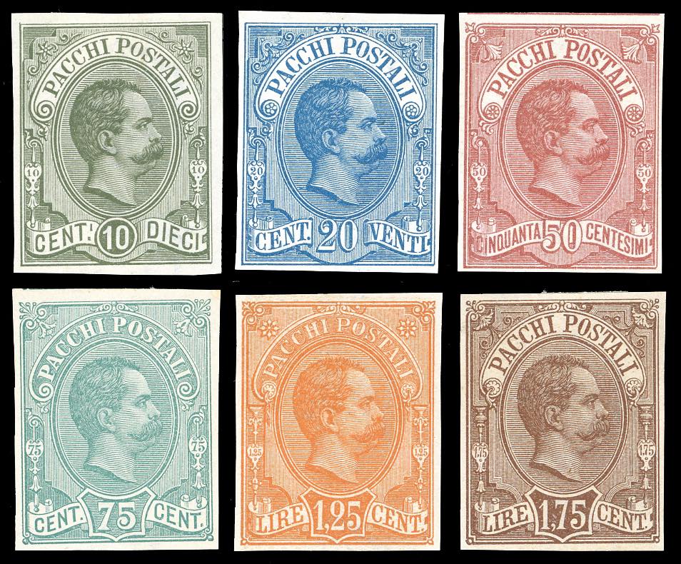 1884/86 - Umberto I, prove d'archivio, non dentellate, serie completa (P1/P6), gomma originale, perfette e molto fresche. Rare. Cert. Ferrario.