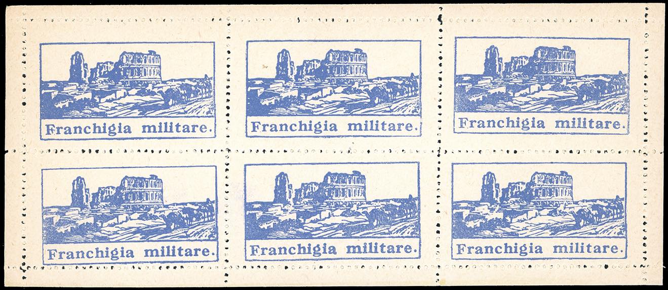 1943 - Franchigia, azzurro oltremare Anfiteatro di El Djem, foglietto di 6 esemplari (F1), gomma originale integra, perfetto. Cert. Diena.