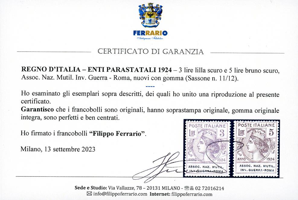 ASSOC.NAZ.MUTIL.INV.GUERRA-ROMA 1924 - 3 e 5 lire, alti valori (11/12), nuovi, gomma originale integra, perfetti. Molto belli e ben centrati. Chiavarello, cert. Ferrario.