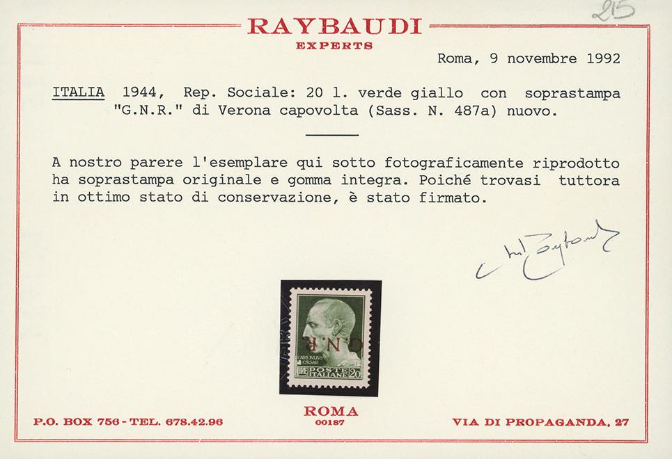 1944 - Soprastampati G.N.R., tiratura di Verona, serie completa con soprastampa capovolta (470a/489a), gomma originale integra, perfetti, piccolo puntino di ossidazione sul 50 lire. Raro insieme. Tutti firmati da noti periti, tre cert. Raybaudi e due Chiavarello.