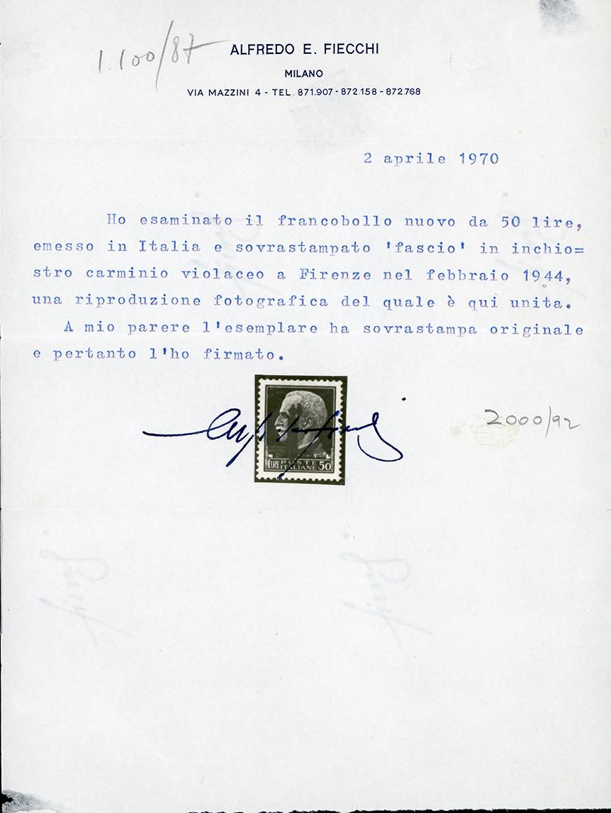 1944 - 50 lire violetto, soprastampato fascio in lilla di Firenze (500), nuovo, gomma originale integra, perfetto. Molto fresco e ottimamente centrato. Cert. Ferrario e Fiecchi.